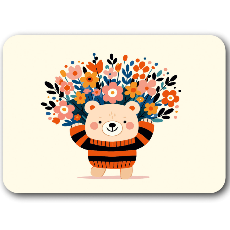 Deze kwalitatief mooie ansichtkaart heeft een afbeelding van een beer met een boeket bloemen.