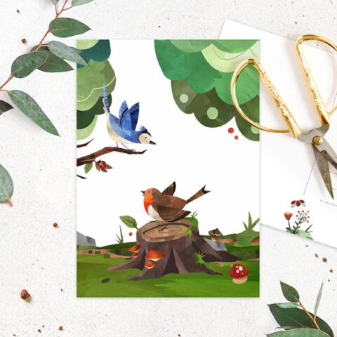 Tags: boomstam, buiten, kaart, kaarten, natuur, paddestoel, samen, studio draak, vogel, vogels, vriendschap