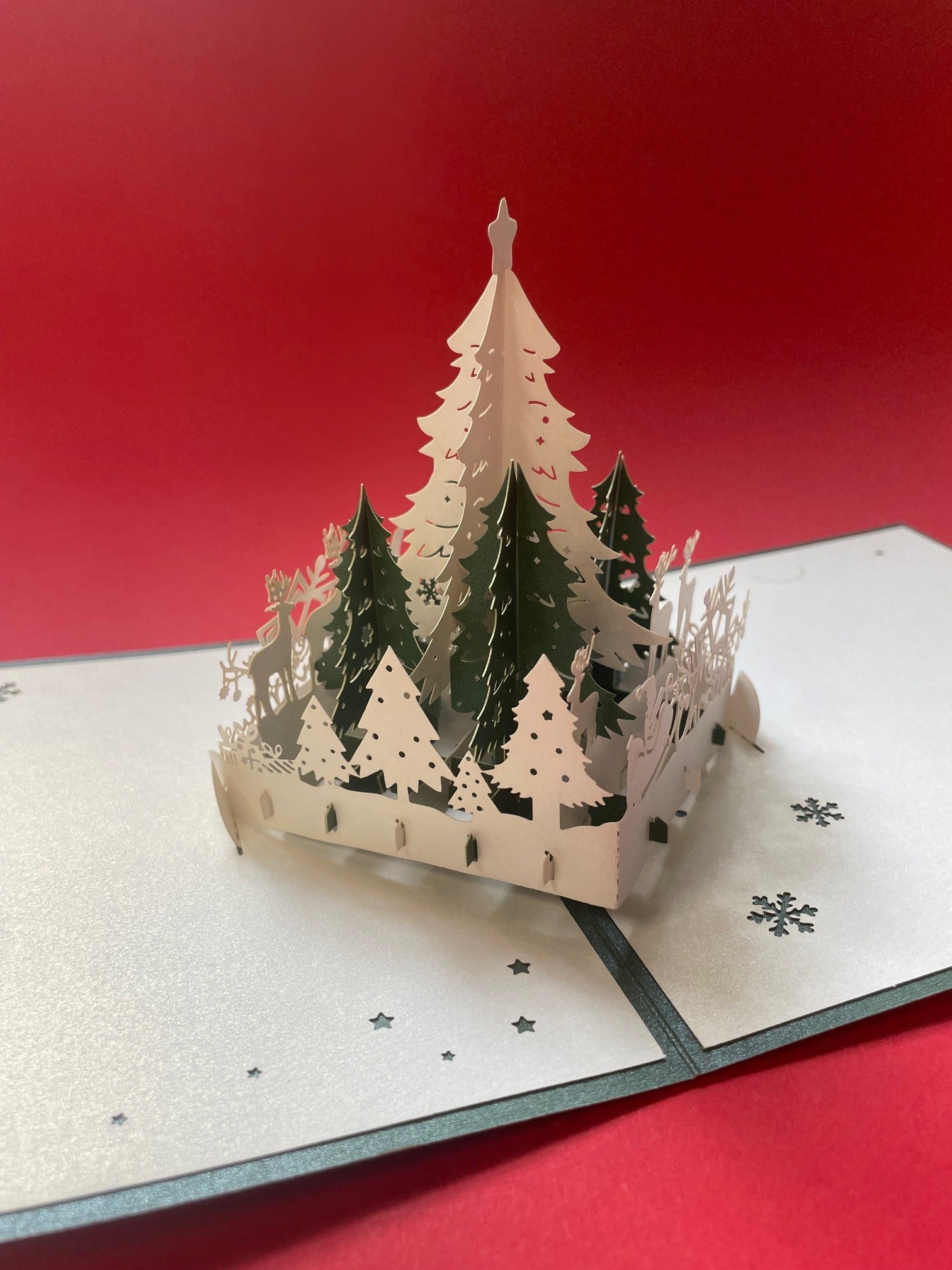 Deze mooie 3D kerstkaart is een uitklapbare kaart vaneen witte kerstboom omringd door groene kerstbomen met daarvoor rendieren en een kerstman in een arreslee. Op de voorzijde staat de tekst Merry Christmas. Wordt geleverd met bijpassende envelop.