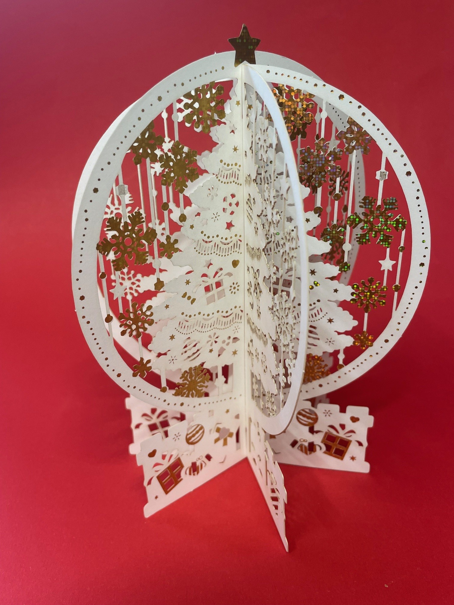 Deze mooie 3D kerstkaart is een uitklapbare kaart van een kerstboom in een cirkel die wordt uitgeklapt in 6 delen, de kerstboom is omringd door gouden ornamenten. De kaart blijft gemakkelijk staan. Wordt geleverd met bijpassende envelop.