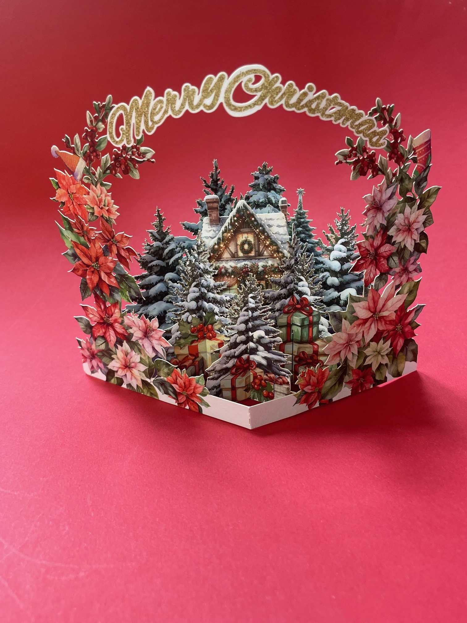 Deze mooie 3D kerstkaart is een uitklapbare kaart van een huis omringd door kerstbomen die bedekt zijn met een laag sneeuw. Erboven staat de tekst Merry Christmas. Wordt geleverd met bijpassende envelop.