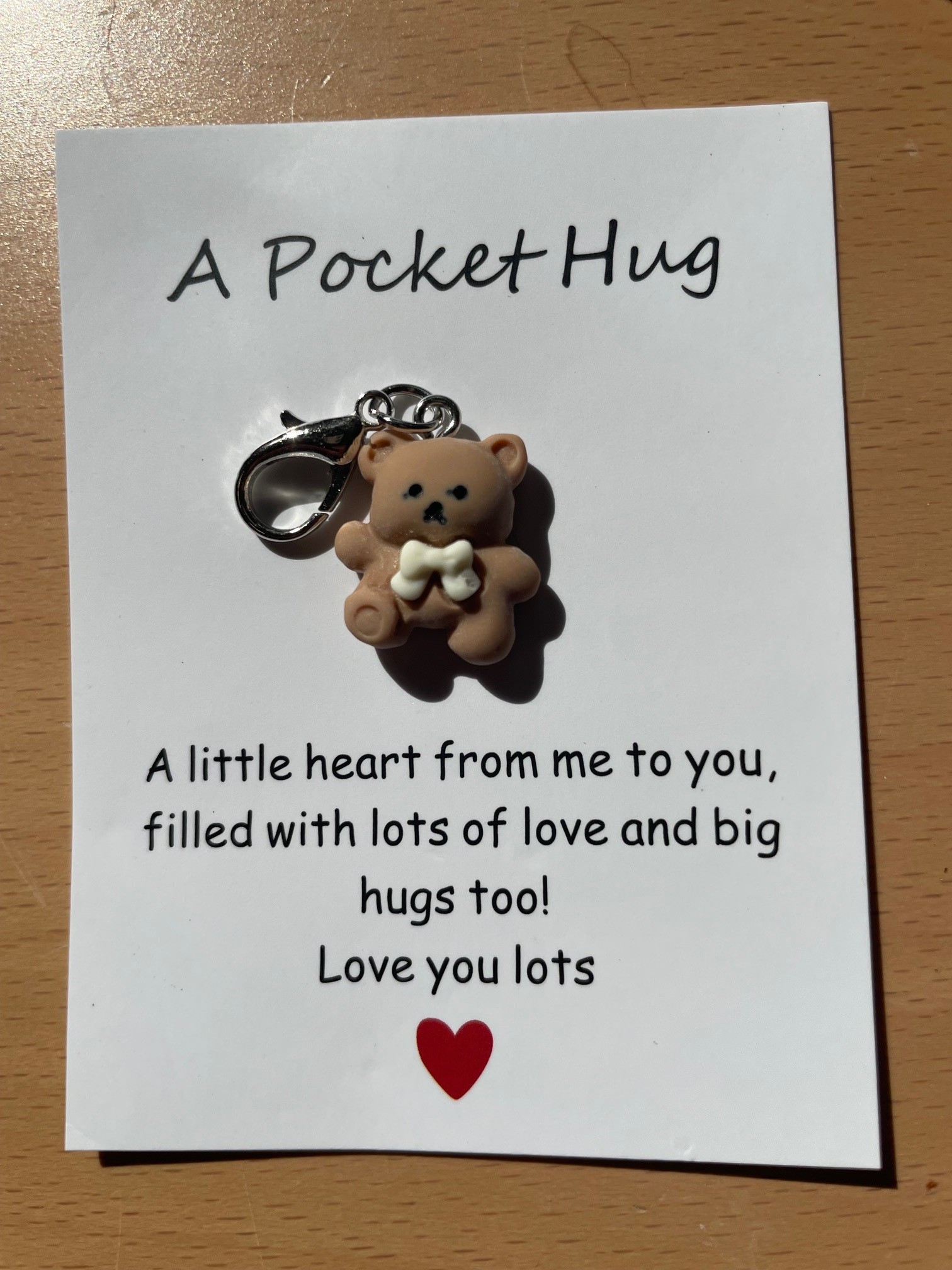 Tags: bear, beer, bruin beertje, geluk, hanger, hart onder de riem, lief kaartje, medeleven, meeleven, opkikker, opkikkertje, pocket hugs, sleutelhanger, succes