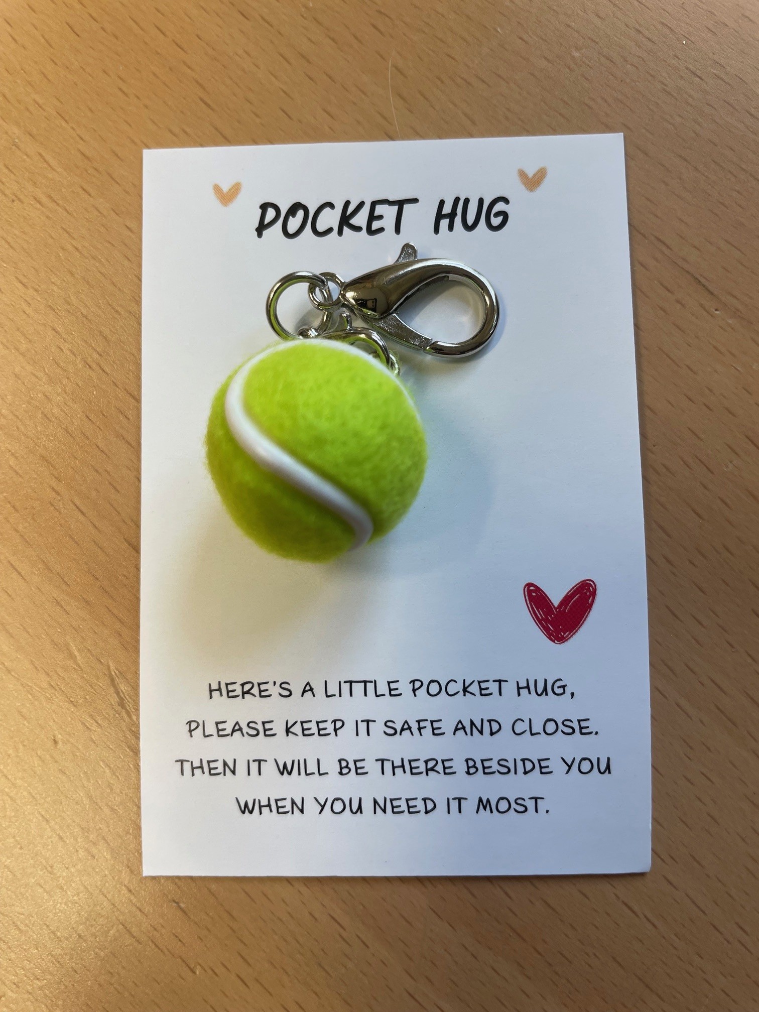 Tags: aandenken, geluk, hanger, hart onder de riem, kampioen, lief kaartje, medeleven, meeleven, opkikker, opkikkertje, pocket hugs, sleutelhanger, succes, tennis, tennisbal, tennisbal hanger, tennisbalhanger
