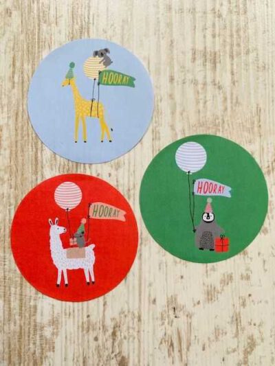 Schattige stickers van een koe, varken en kip in combinatie met goud folie detail.